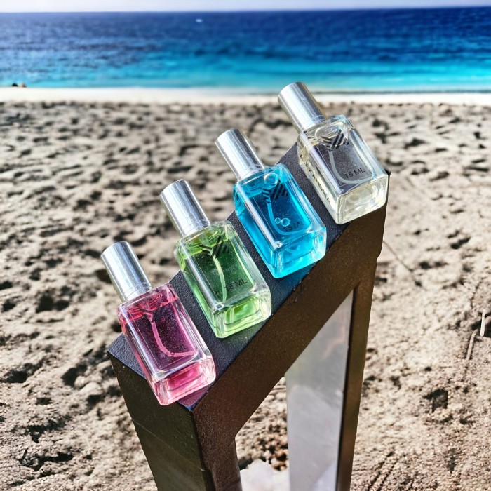 Top notes are Apple, Lemon, Bergamot and Orange Blossom; middle notes are Rose, Teak Wood and Patchouli; base notes are Vanilla and Musk.